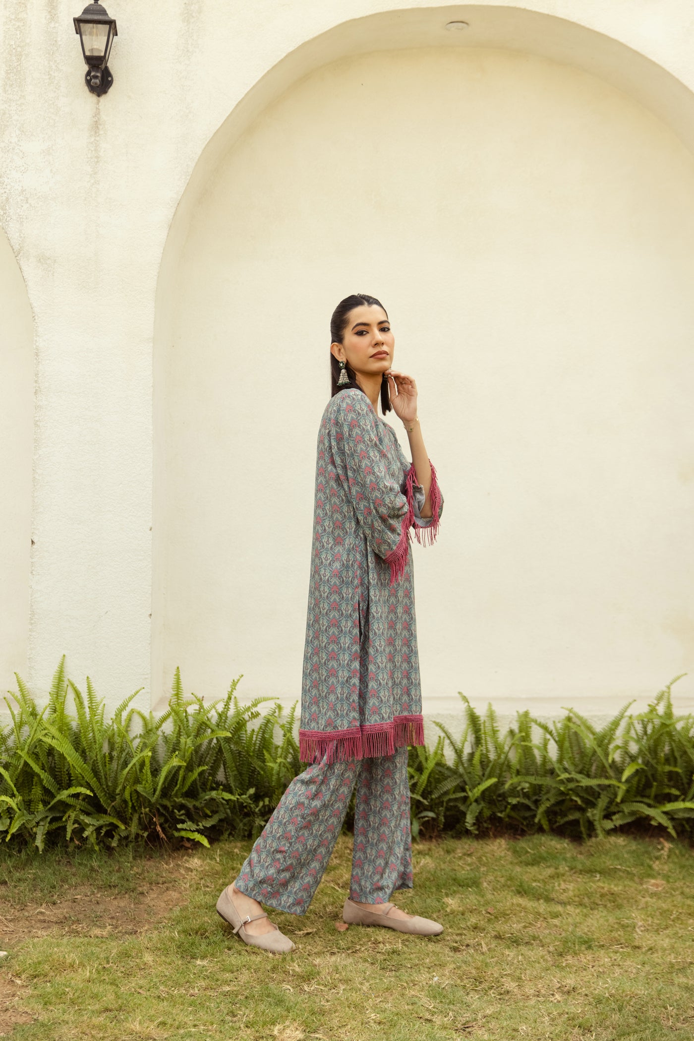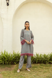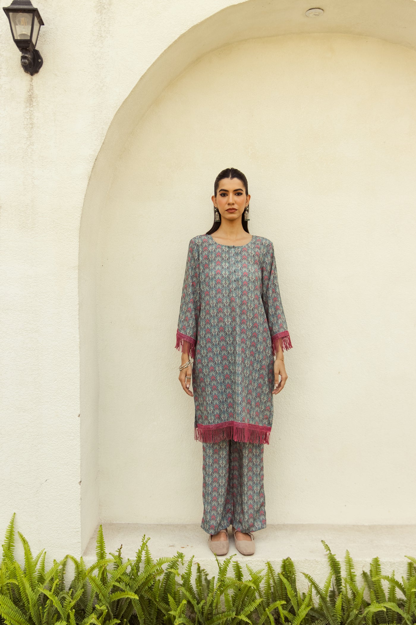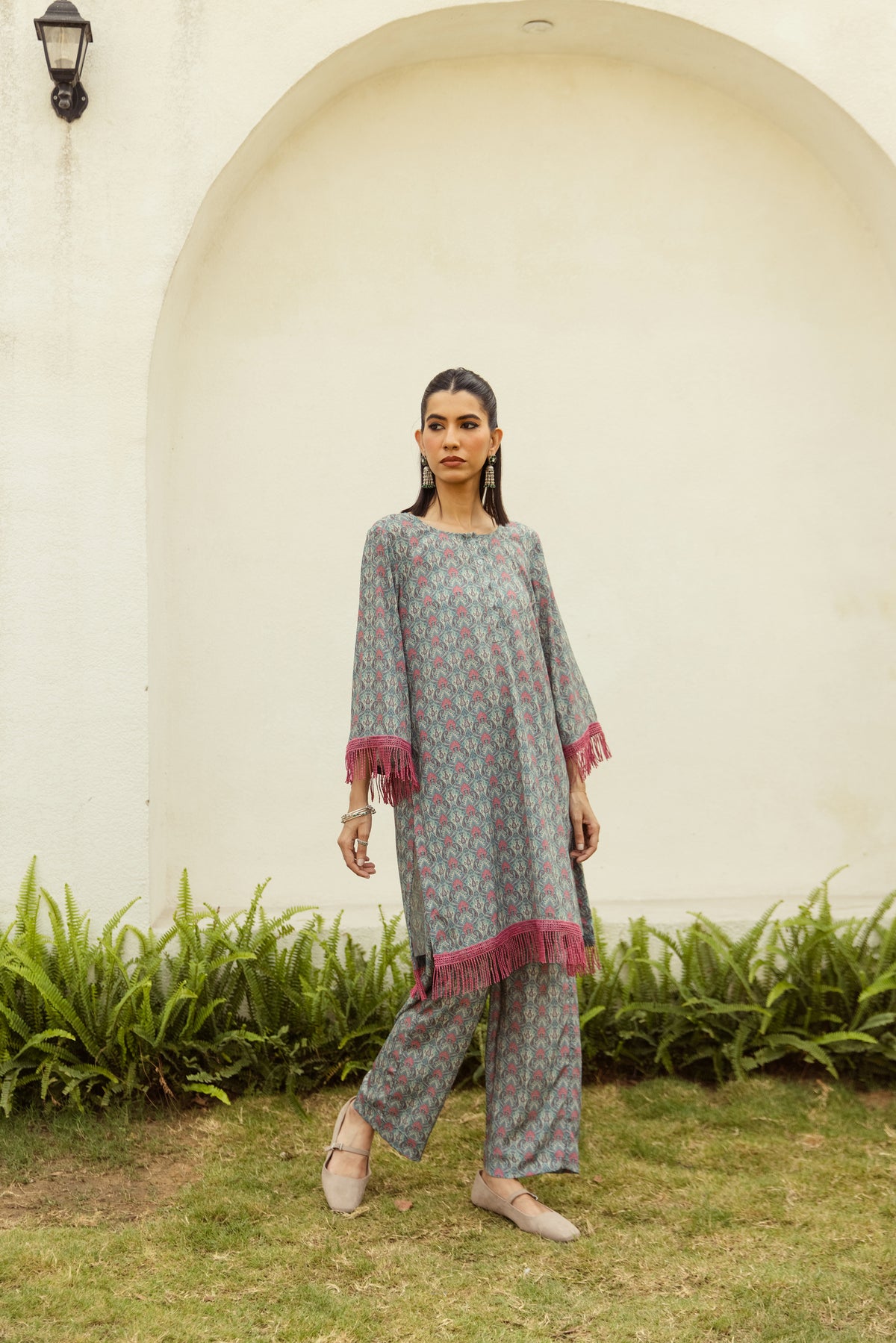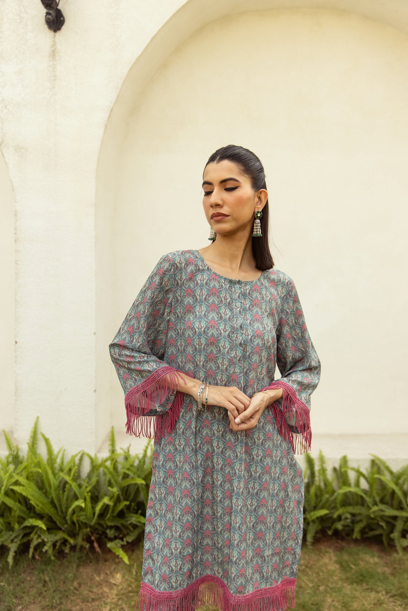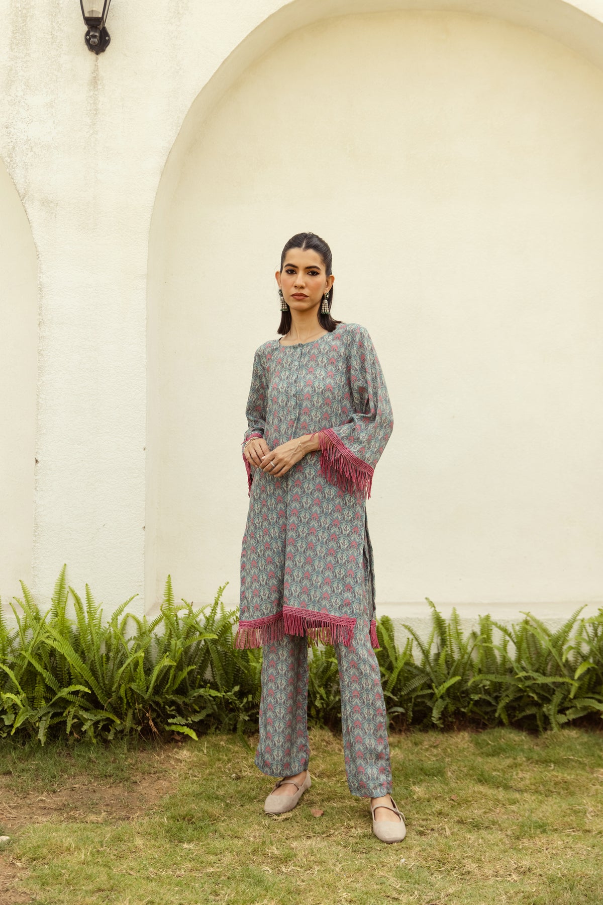 Farshi salwar set with matching crosia fringe lace on sleeves and hem paired with matching farshi salwar.
