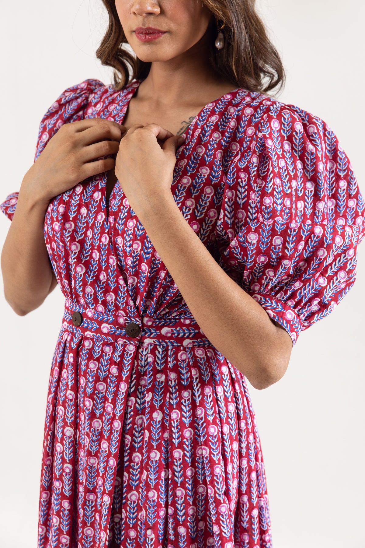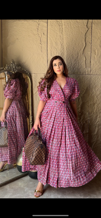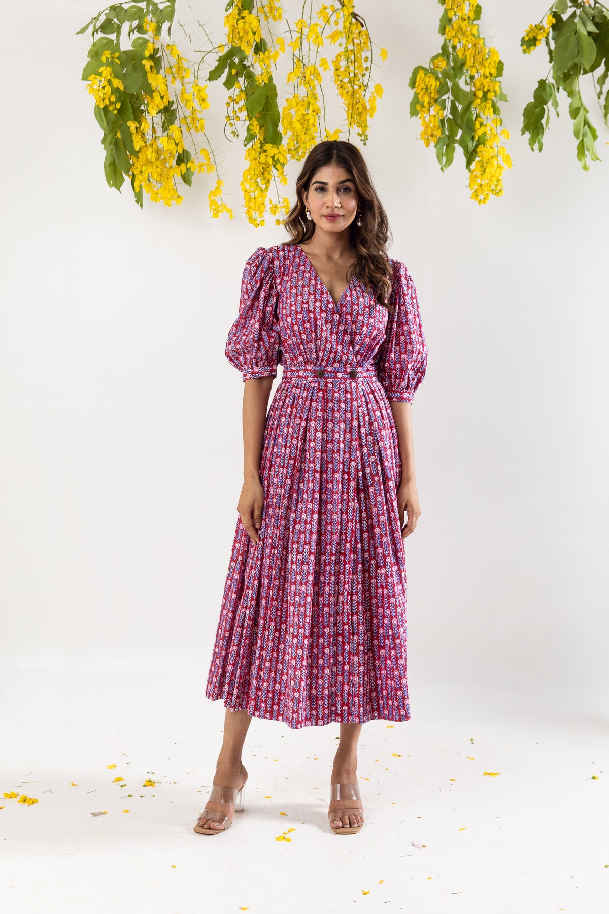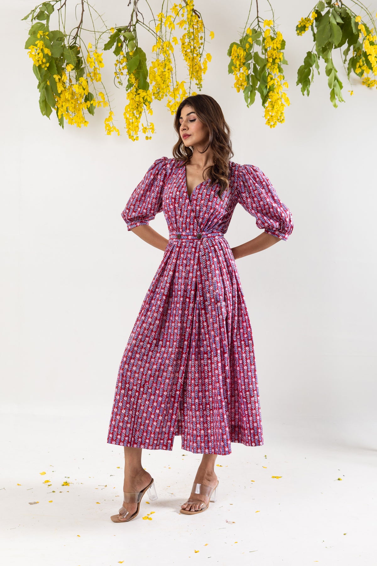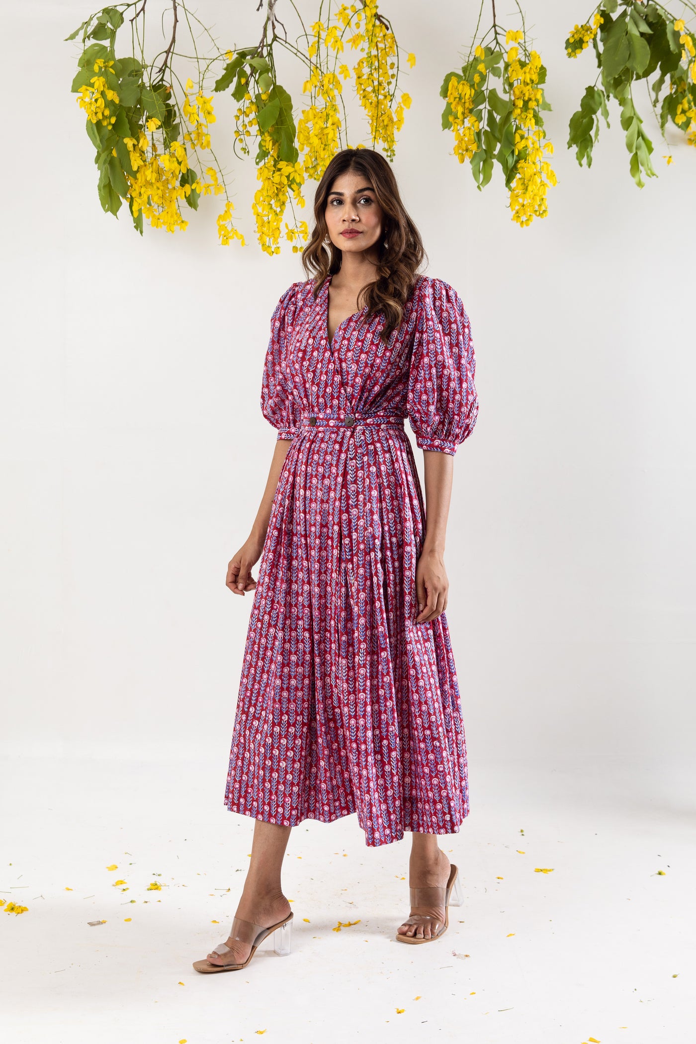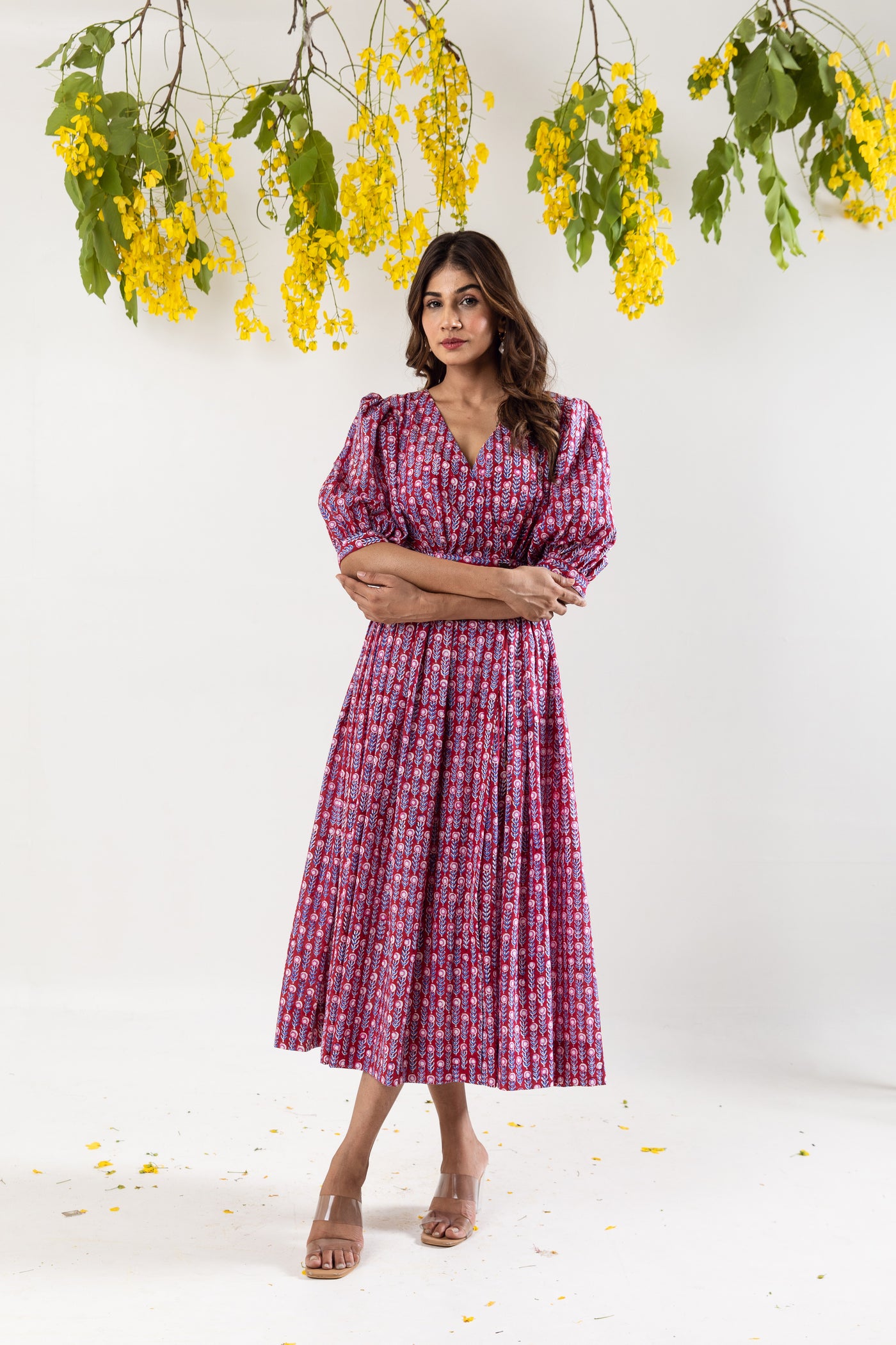 The fabric used to create this dress is completely hand printed and some inconsistency in color and print may occur. We attribute this to the beauty of hand block printed fabrics which leads to exclusivity of the product.