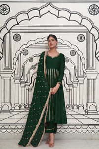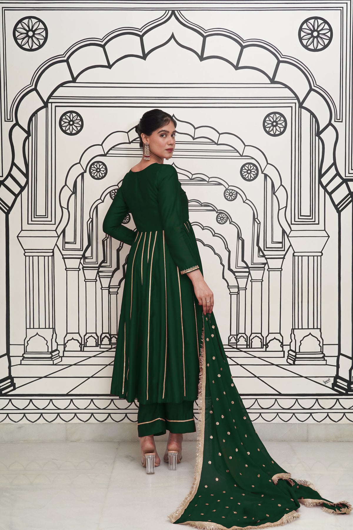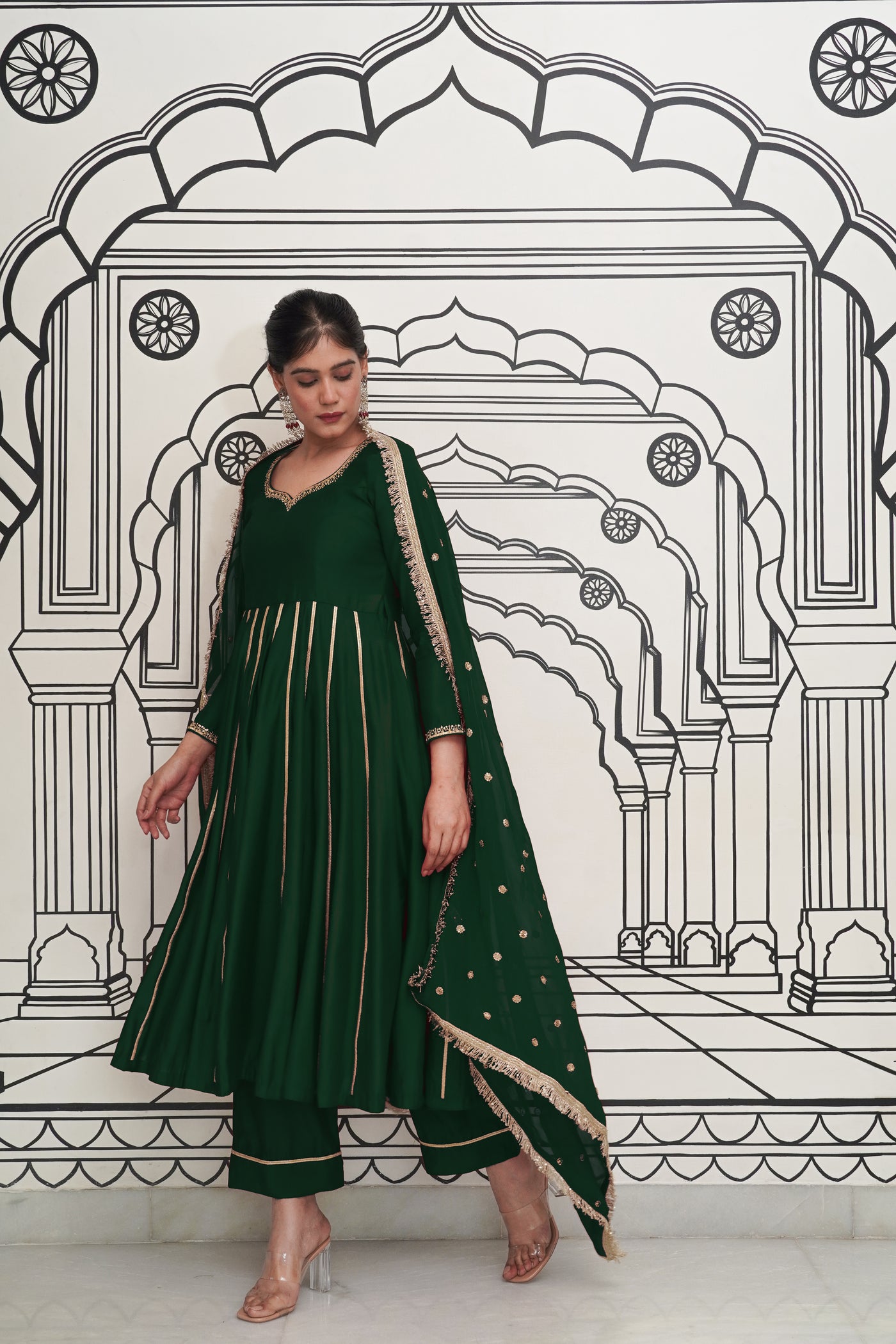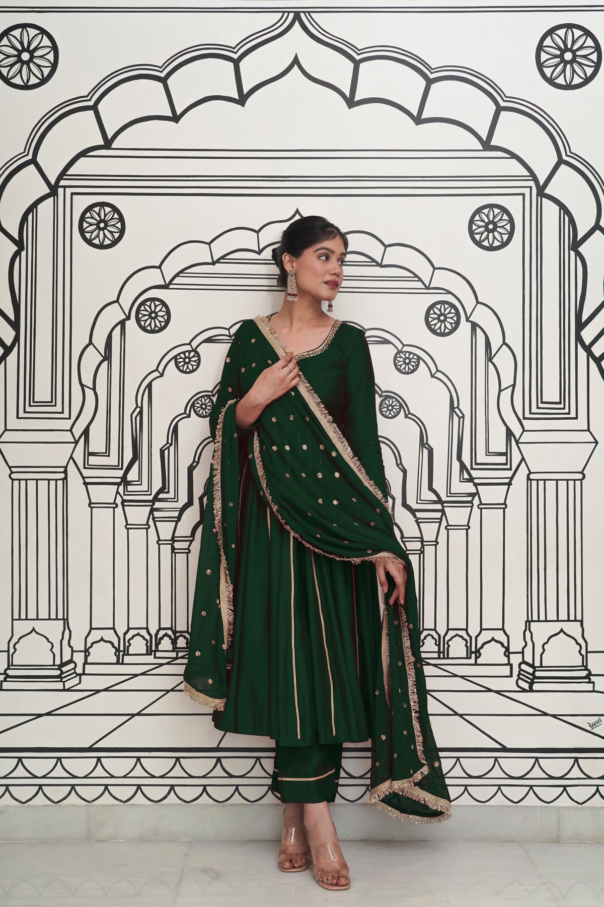 Elegantly handcrafted Anarkali decorated with zari and sequins work on neck and sleeves paired with dupatta decorated with Kiran lace and palazzo pants.