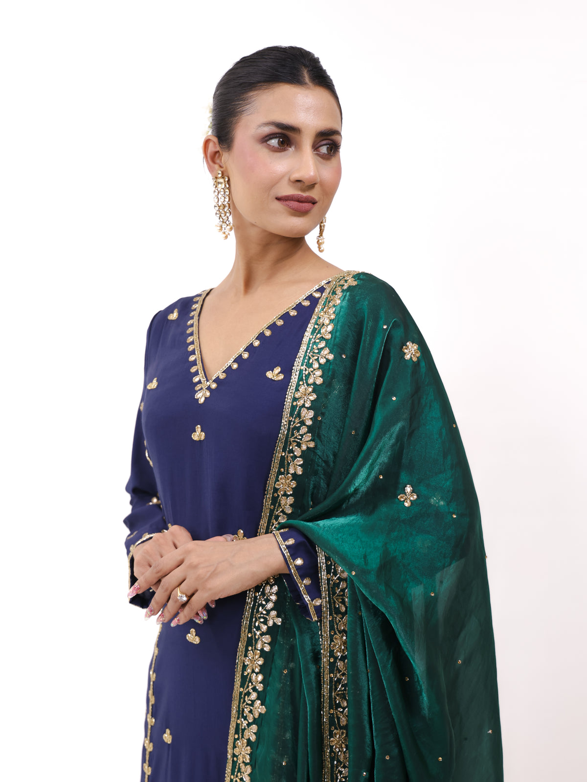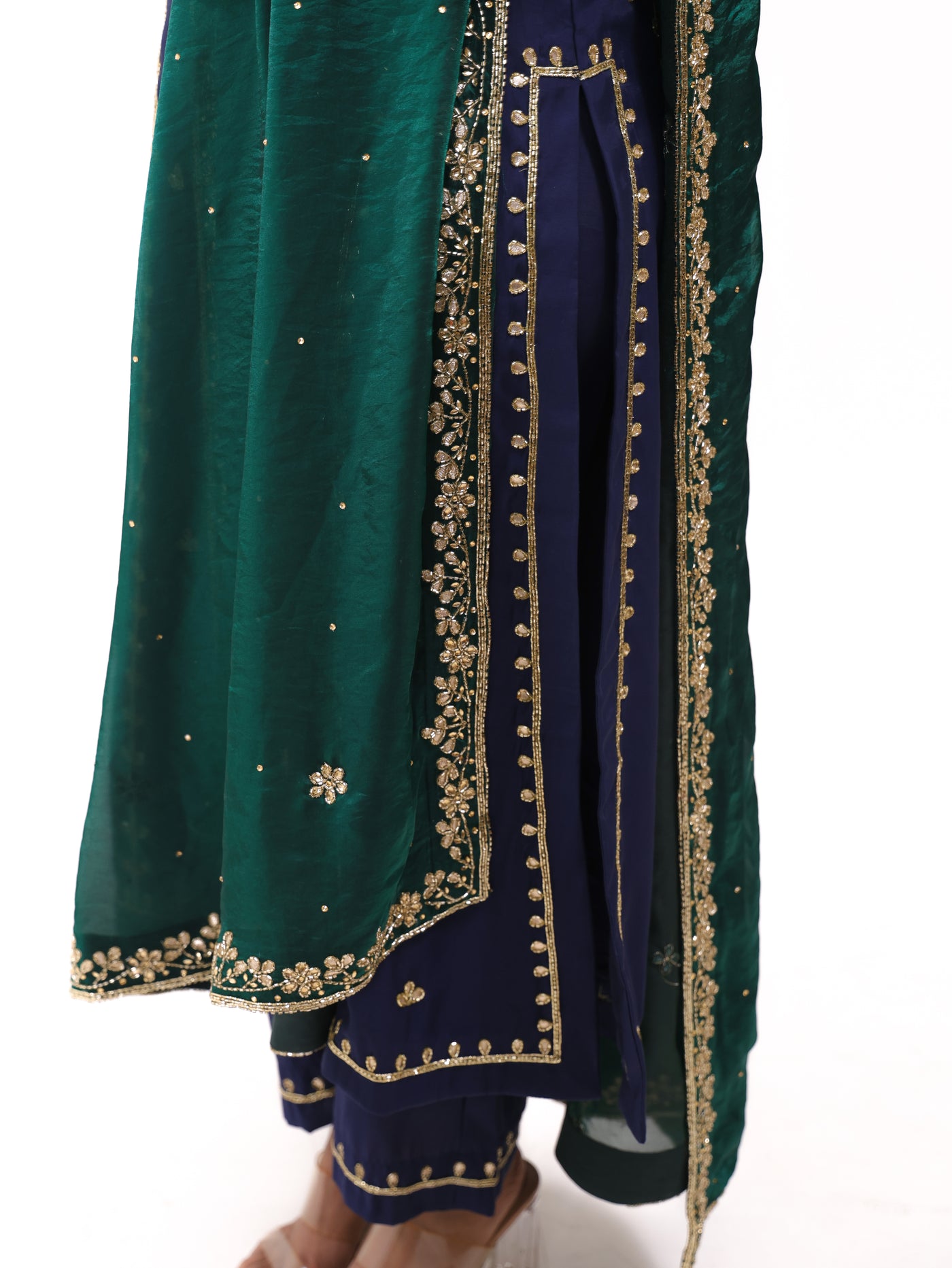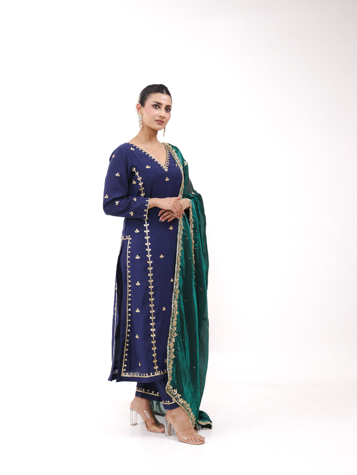 Elegantly handcrafted kurta set decorated with tubelights and sequins work on neck and sleeves paired with dupatta decorated complimenting booti and matching pants.