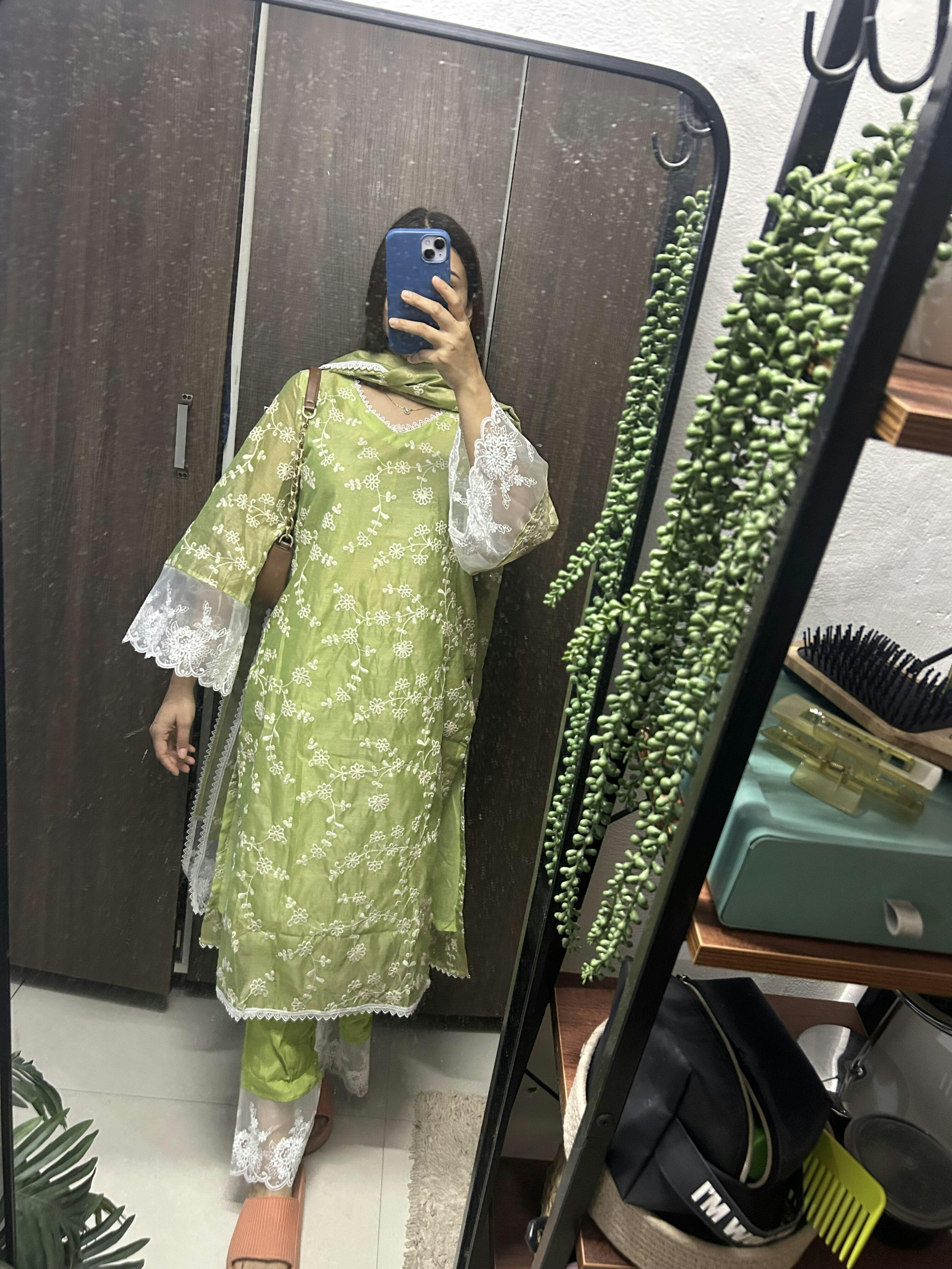 Kurta set in Soft chanderi super breezy fabric and all year round friendly fabric that you can wear anytime of the day, fully stitched tunic with embroidery and organza detailing dupatta set is elegant and at the same time perfect for festive wear.