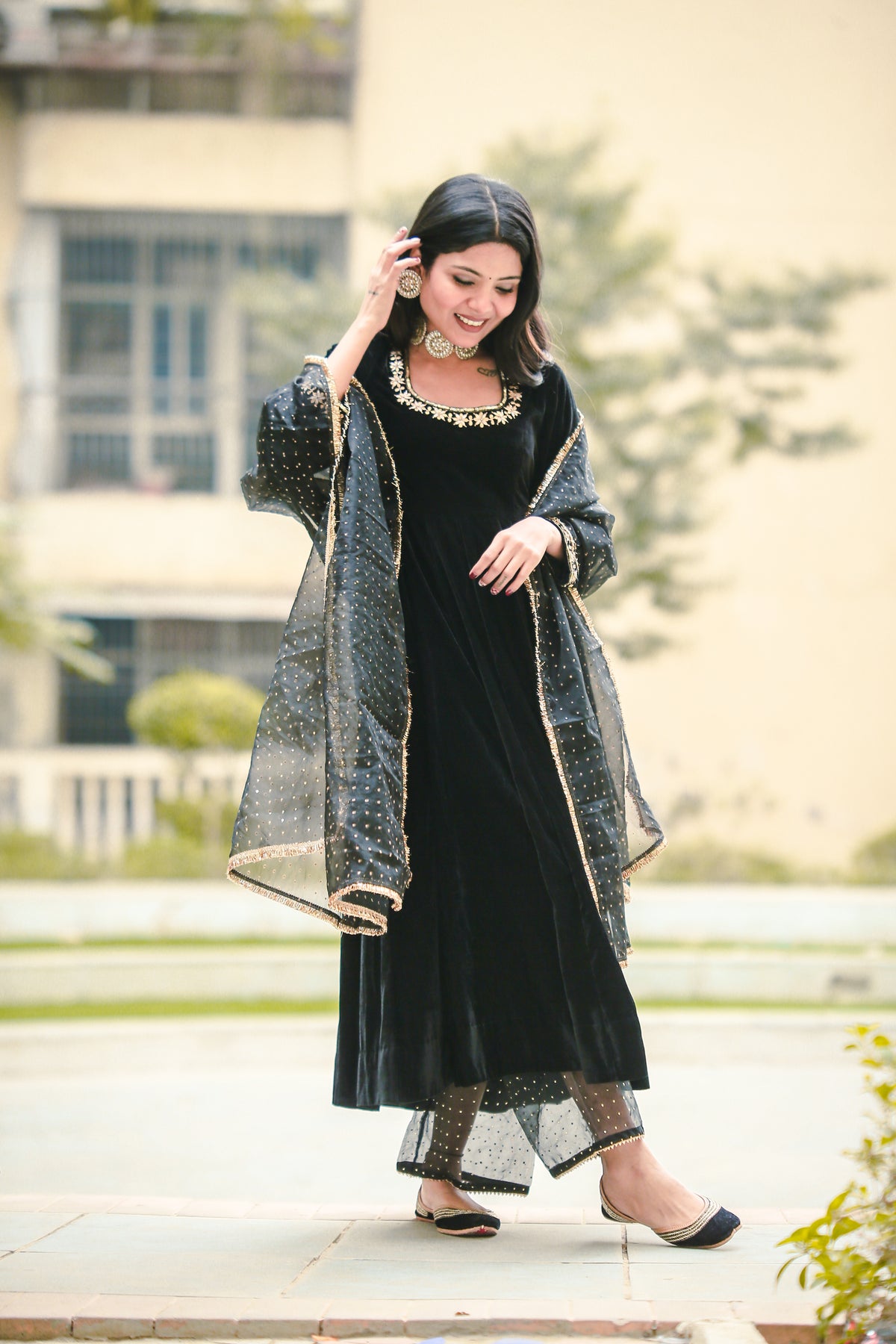 This set includes velvet hand embroidered gotta patti anarkali, plazzo and organza dupatta with mukesh and kiran lace.