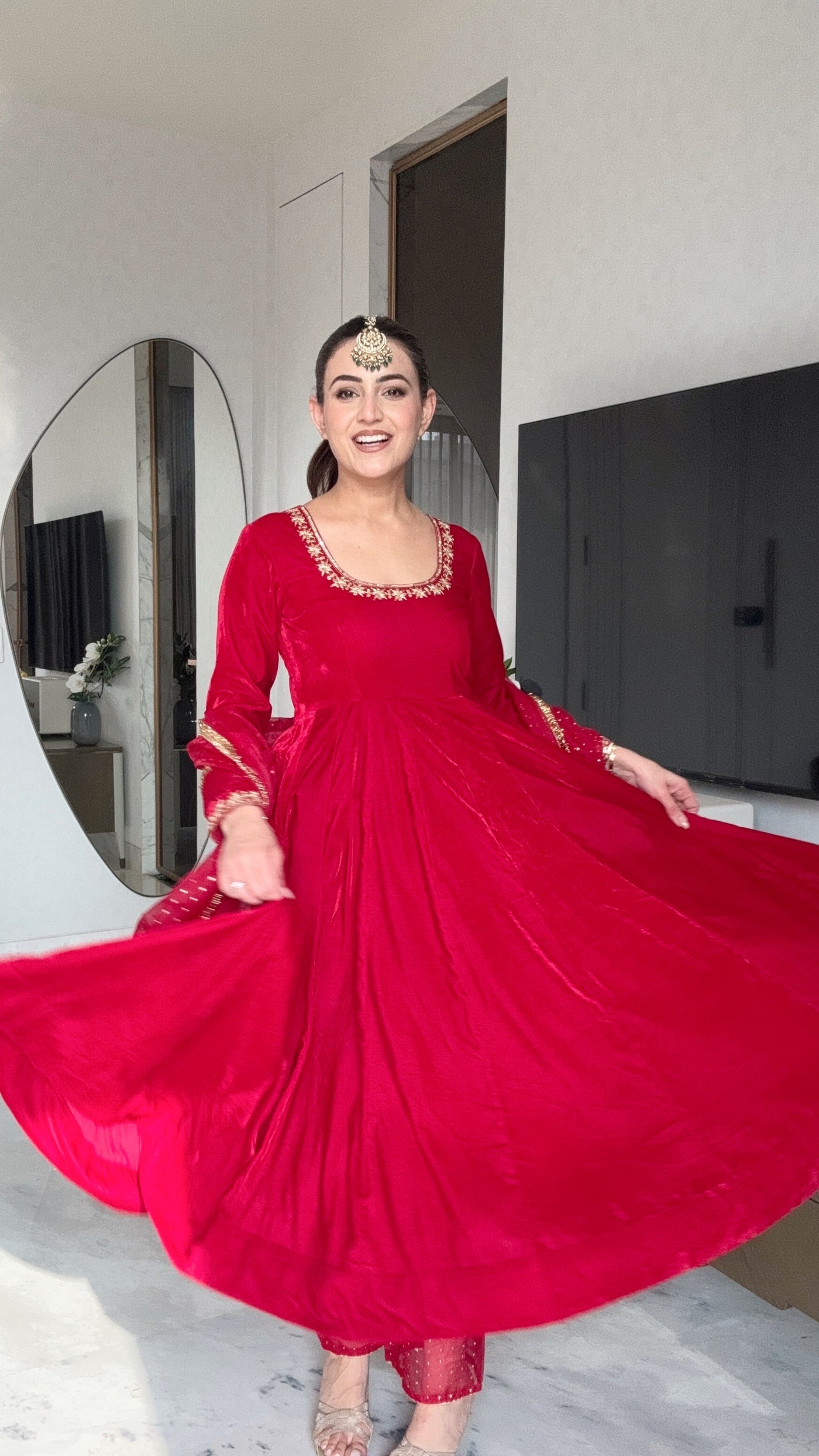 Gorgeous velvet hand embroidered gotta patti Anarkali with bell sleeves, pattern pants and organza dupatta with mukesh and kiran lace.