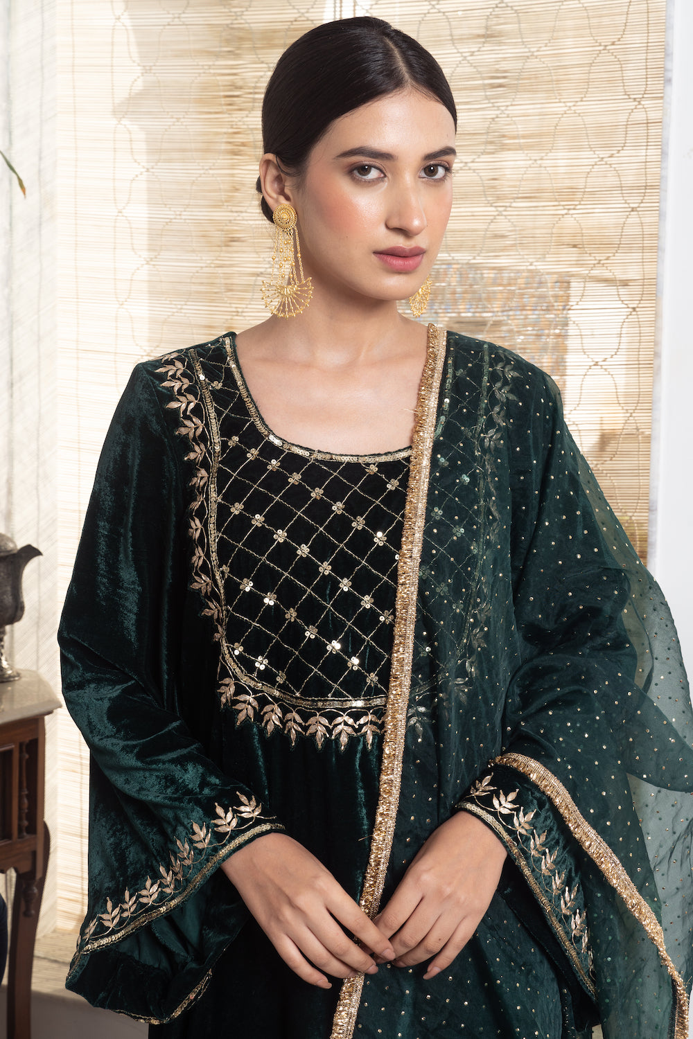 Gorgeous velvet hand embroidered yoke kurta with bell sleeves, plazzo and organza dupatta with mukesh and kiran lace.