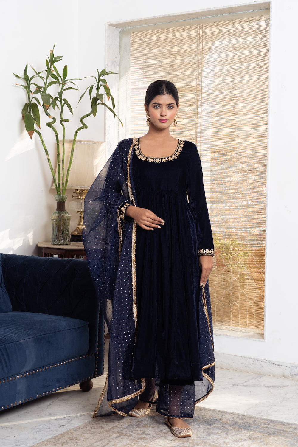 Gorgeous velvet hand embroidered gotta patti anarkali, plazzo and organza dupatta with mukesh and kiran lace.