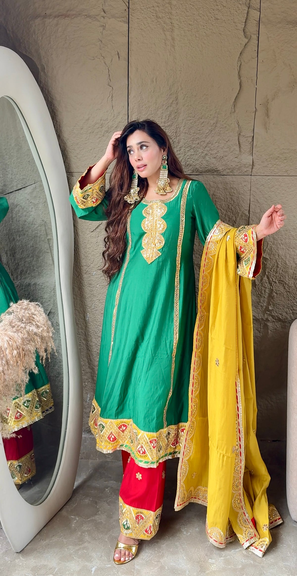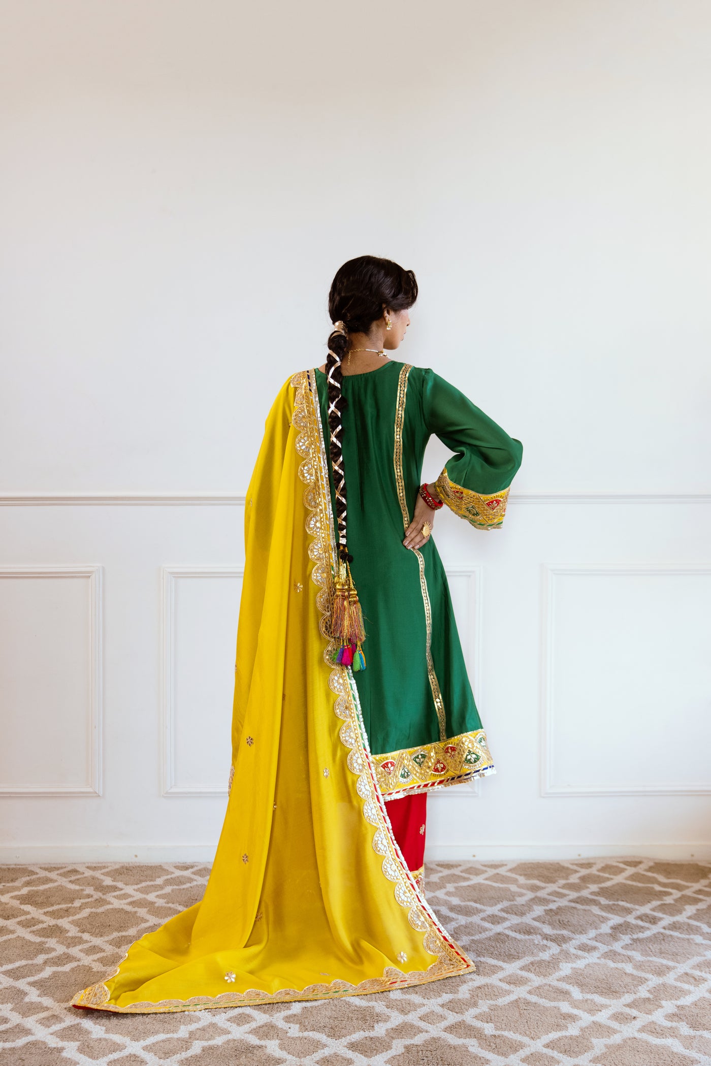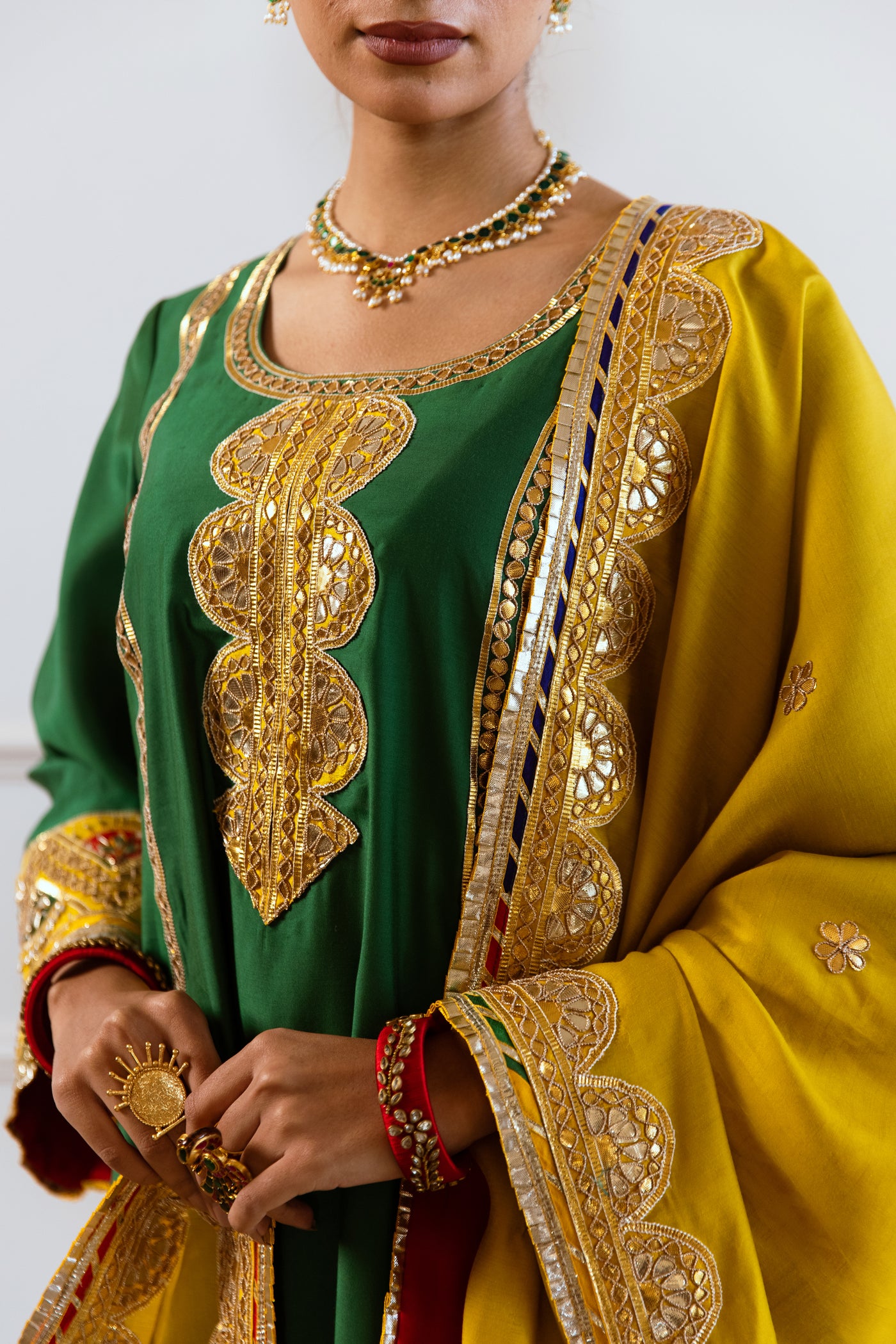 Elegantly handcrafted Anarkali with intricate gotta Patti embroidered on neck, sleeves and hem paired with dupatta decorated with mugzi lace and flared plazzo pants.
